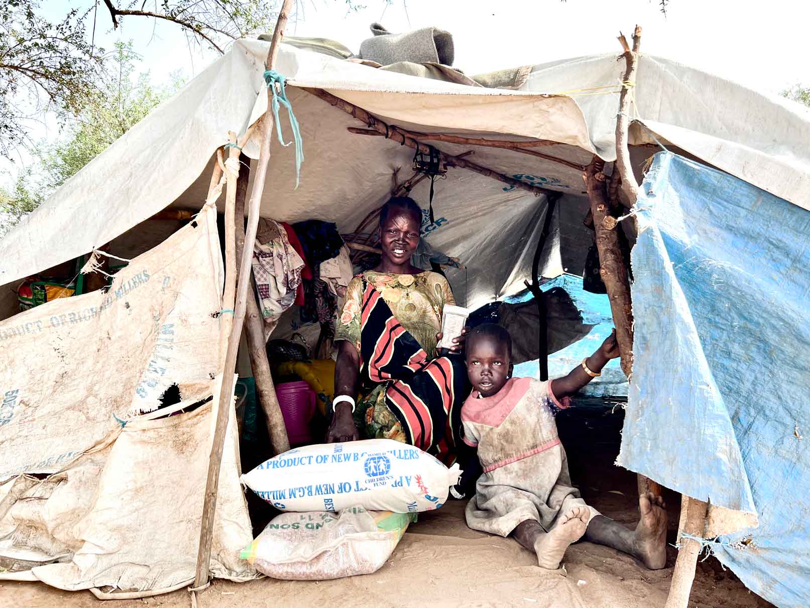 One mother and her four children live in a tent she constructed herself with sticks and plastic. She says she first ran from their village and then walked for two days toward Juba. She journeyed with three of her children in tow, while pregnant with the fourth, and gave birth here shortly after her arrival. Her husband stayed behind to fight. She says it is impossible find food and is grateful for the assistance from WCF. When the food supplies run out, she and the others in the settlement eat the leaves from the trees.